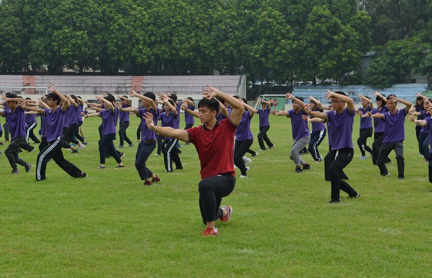 9月14日清晨,新生们齐齐换上了紫色的营服,开始学习16式暨南拳。与往年的五步拳不同,16式暨南拳由暨南大学体育学院老师、前国家武术一级运动员潘冬以及全国太极拳大赛冠军甘雷主创,策划时间长达一年,编排了近半年,其中还经历了6次微调,终确定为16个动作,2个八拍。16式拳融合了粤港澳地区的咏春拳、洪拳、蔡李拳等拳法,提炼出具有岭南文化特色的武术拳法。