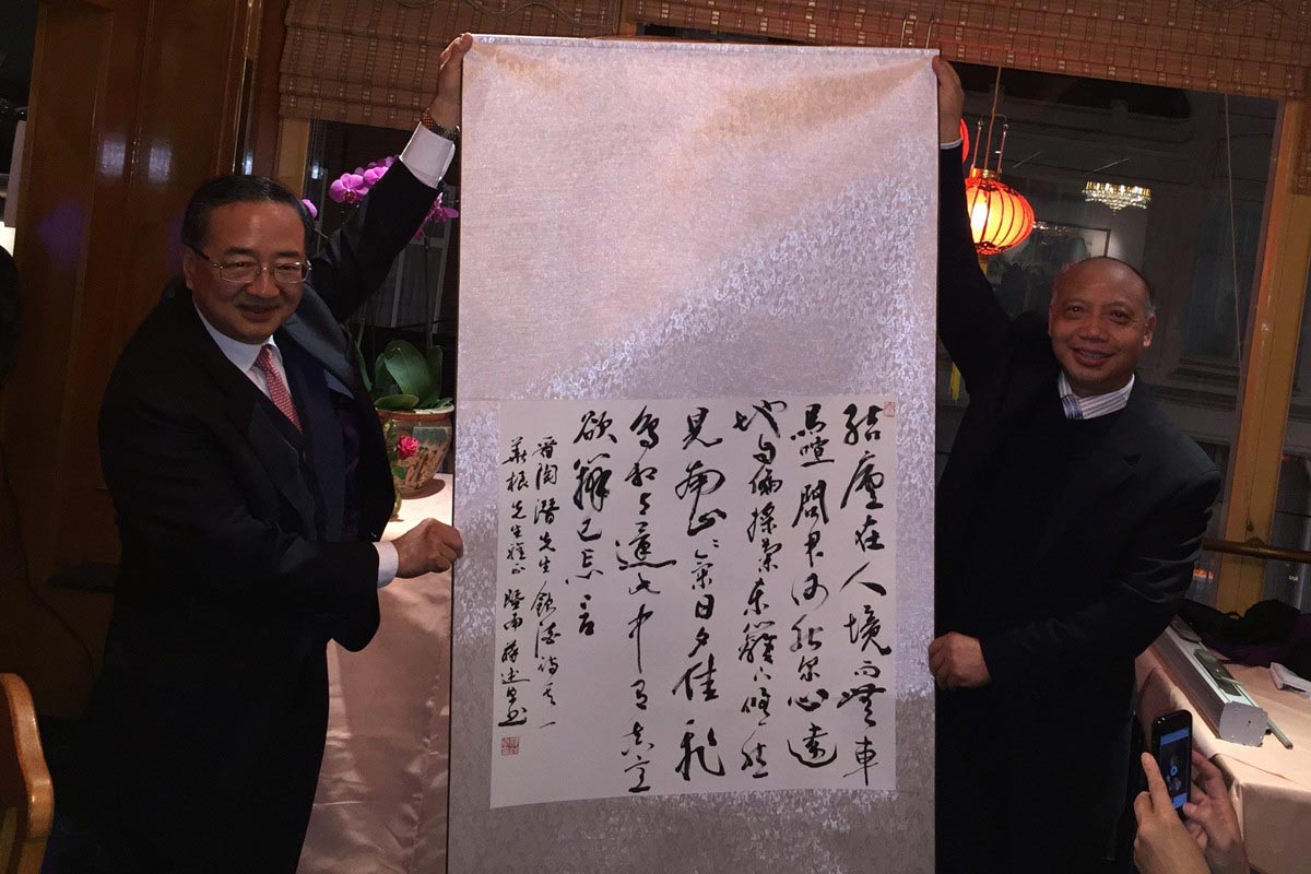 蒋述卓书记向杨华根校董赠送自己的书法作品《饮酒》