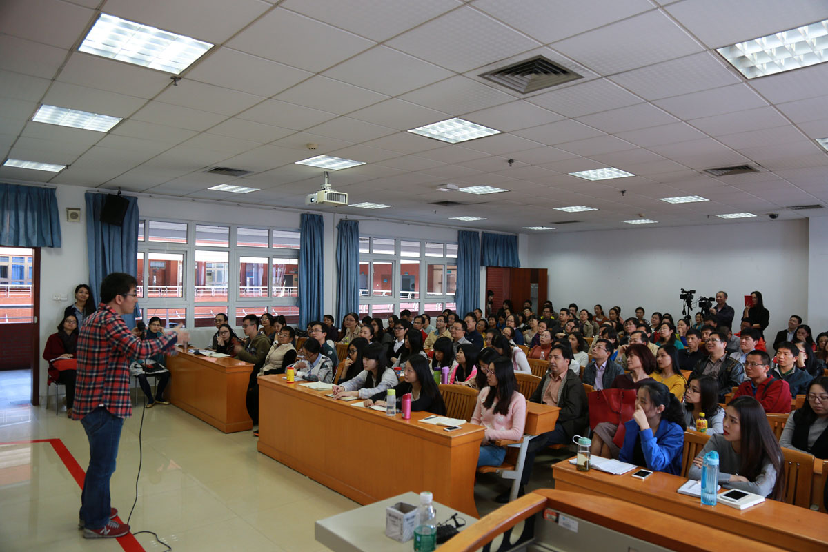 尽管广州已经成功“入冬”,但仍难掩本次教学观摩课火爆异常的气氛。120多名本科专任教师涌入课堂,教室一位难求,甚至有教师站着听完课程。从“美苏冷战”到“山河故人”,从“金瓶梅”到“庆安枪击案”,从“雾霾”到“房奴”,刘涛从日常生活、习以为常的社会事件中分析出背后的传播学原理,独特的视角、犀利的语言、精辟的分析,紧紧抓住了在场师生的耳朵。课堂气氛非常活跃,全场爆发的笑声不断。