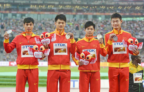 2015年世界田径锦标赛男子4x100米接力亚军队伍(左一为莫有雪,左三为苏炳添)