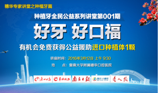2016年3月12日上午9:30,种植牙全民公益系列讲堂第001期将邀请穗华口腔医院资深种植科专家张春雷主任现场为缺牙者讲解种植牙究竟有多痛,解析种植牙手术案例以及种植牙手术视频全程细节,并为缺牙者解疑答惑。
