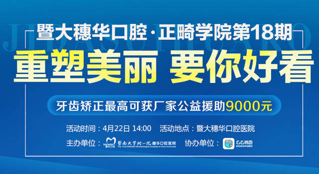 为了解除您对牙齿美观的困扰,还您自信笑容,重塑美丽,穗华口腔医院联合么么钱包将于2017年4月22日举办穗华口腔医院·正畸学院第18期“重塑美丽 要你好看”。届时,口腔行业内牙齿矫正名医专家将为广大正畸患者揭开牙齿矫正的神秘面纱,为正畸患者设计矫牙方案,让正畸患者实现美丽梦想,重拾自信笑容。