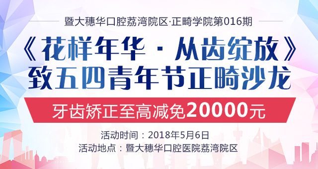 为了鼓励更多的青年踏出矫正的这一步,正式与困扰自己已久的畸形牙彻底告别,穗华口腔医院将在5月6日下午举行穗华口腔医院·正畸学院荔湾院区第16 期之《花样年华·从齿蜕变》致五四青年节正畸沙龙活动。为此特地请到了著名的正畸专家,为羊城市民带来正畸沙龙活动,届时将有多重优惠为青春助力相行。