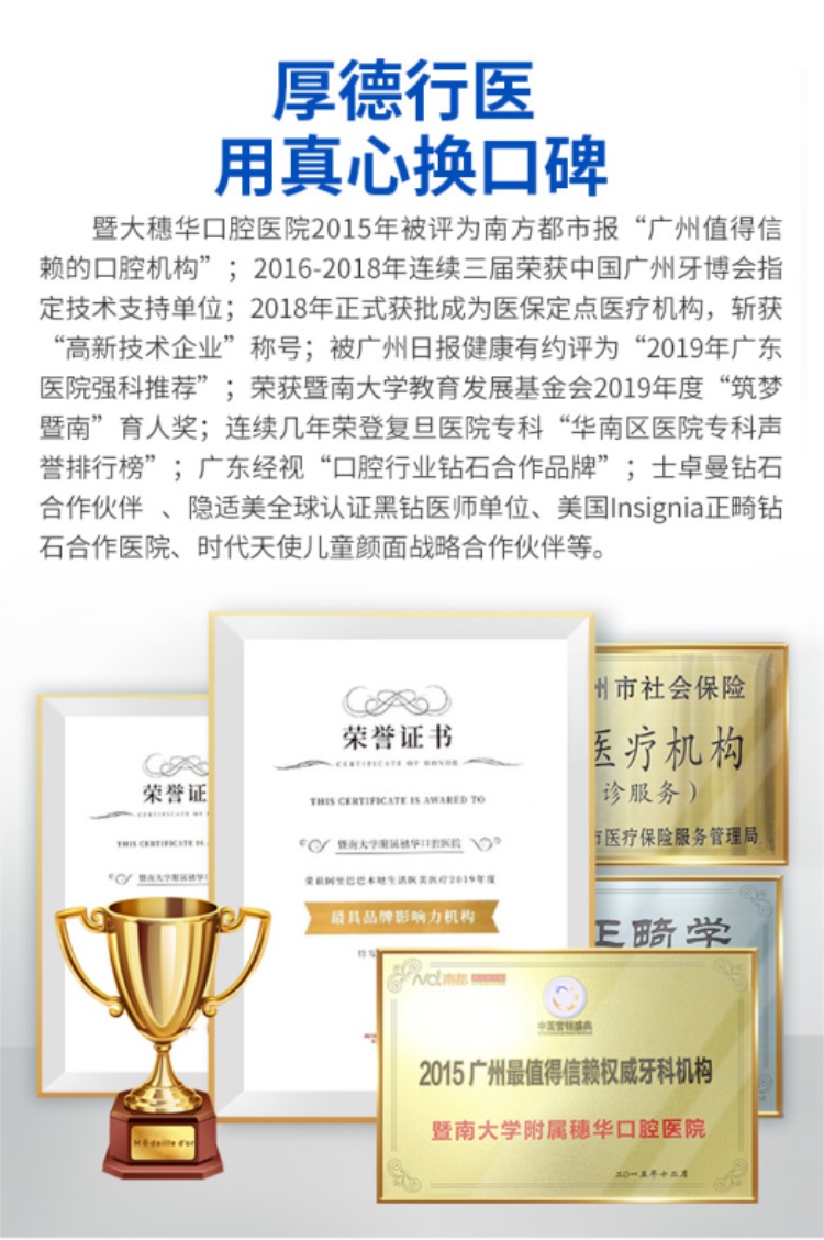穗华口腔医院正畸科由拥有数十年正畸临床经验的孔卫东院长、肖世芳副院长领衔的硕博正畸团队组成,精研数字化舌侧、数字化隐形、数字化固定等矫治技术,拥有eBrace舌侧矫正专利技术。科室引进国际领先的人工智能数字化正畸检查系统,运用3D数字化诊查设备、AI数字化根骨监控系统,实现正畸诊疗一站式数字化操作,满足个性化、复杂化、高难度的正畸需求。