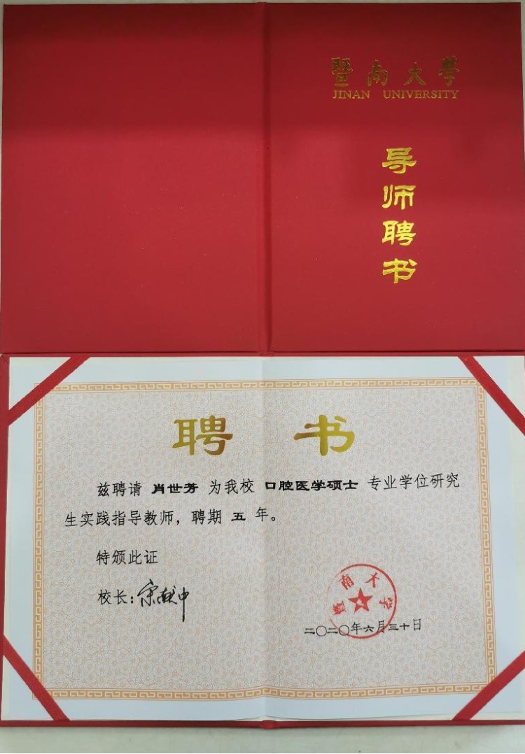 肖世芳院长获得暨南大学口腔医学硕士专业学位研究生实践指导教师聘书