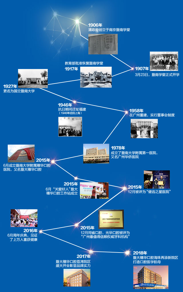 暨南大学前身“暨南学堂”于1906年创立,是国家211工程重点大学、985工程优势学科创新平台,其口腔医学教育、科研一直走在前列。